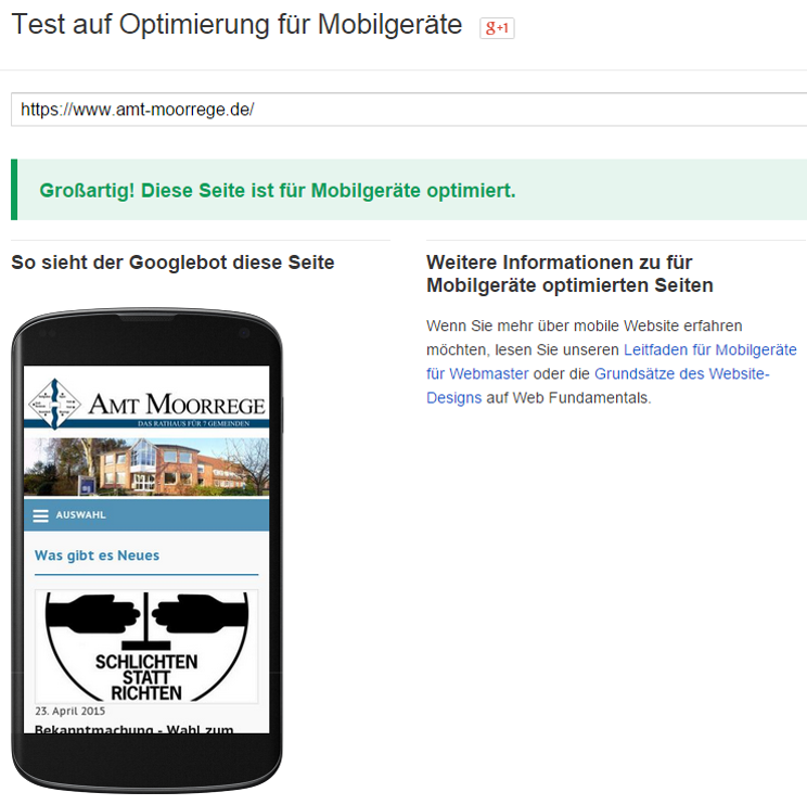 | Ob eine Seite für die mobile Darstellung optimiert ist, kann man testen unter www.google.com/webmasters/tools/mobile-friendly |