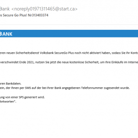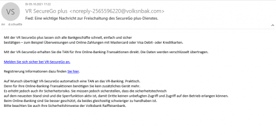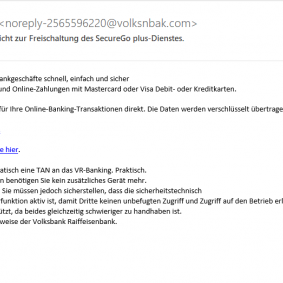 Die aktuellsten Mails beziehen sich auf den Sicherheitsdienst VR SecureGo plus, eine reale App der Volksbank für die Freigabe von Online-Zahlungen mit Kreditkarte. Die Schreiben haben z.B. den Betreff Fwd: Eine wichtige Nachricht zur Freischaltung des SecureGo plus-Dienstes. und sollen in allen Fällen den Volksbank-Kunden dazu bewegen, auf einen in der Mail mitgeschickten Link oder Button zu klicken, um den Dienst VR SecureGo Plus frei zu schalten. Tut der Empfänger das, spielt er den Betrügern seine Banking-Daten direkt in die Hände.